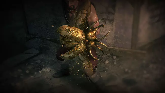Muda a aparência de qualquer Escudo Equipado para o Escudo do Escaravelho Voador Dourado. Um enxame de escaravelhos te circula quando você bloquear.